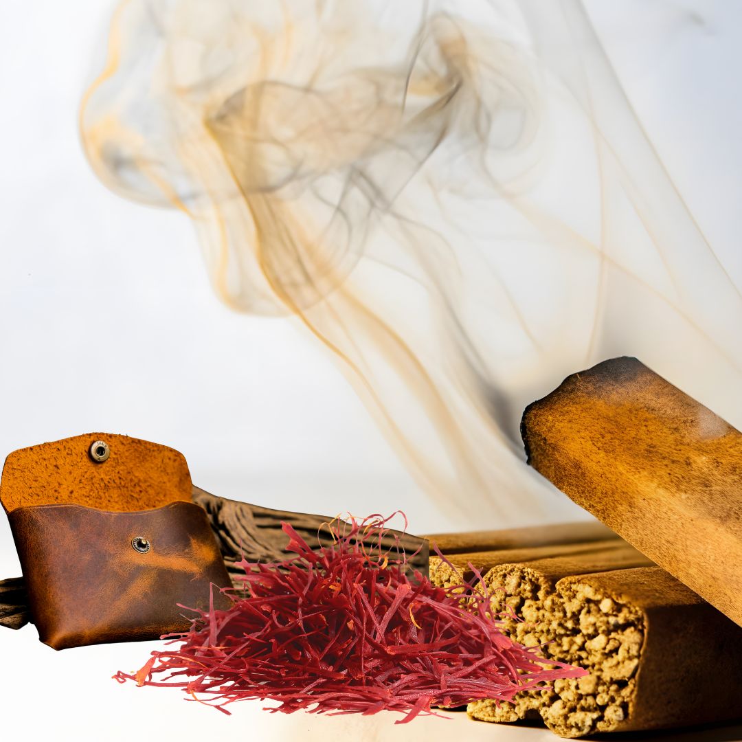 leer, saffraan, gerookt hout